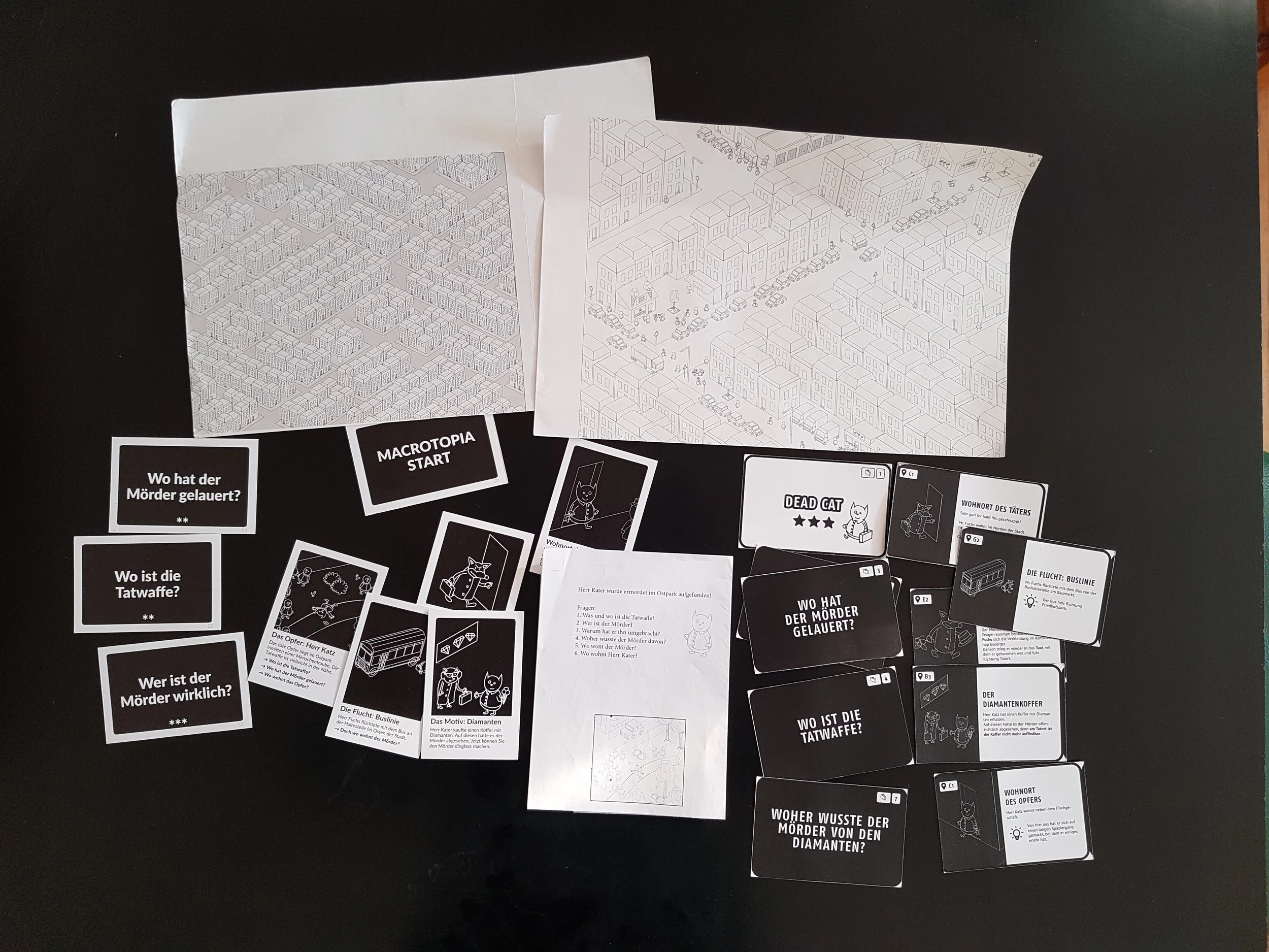 We developed the first prototype with a first case, "Dead Cat," and playtested it. And people loved it. They wanted more of this. At that point, we discovered that one of the biggest advantages of the concept was the accessibility. You don't need to read the rules or do a lot of preparation. (Well, you do need a big table and good lighting!) And this advantage was even stronger without needing to use a smartphone, so we got rid of this. (But this idea is still in our heads, maybe one day we'll make this version.)