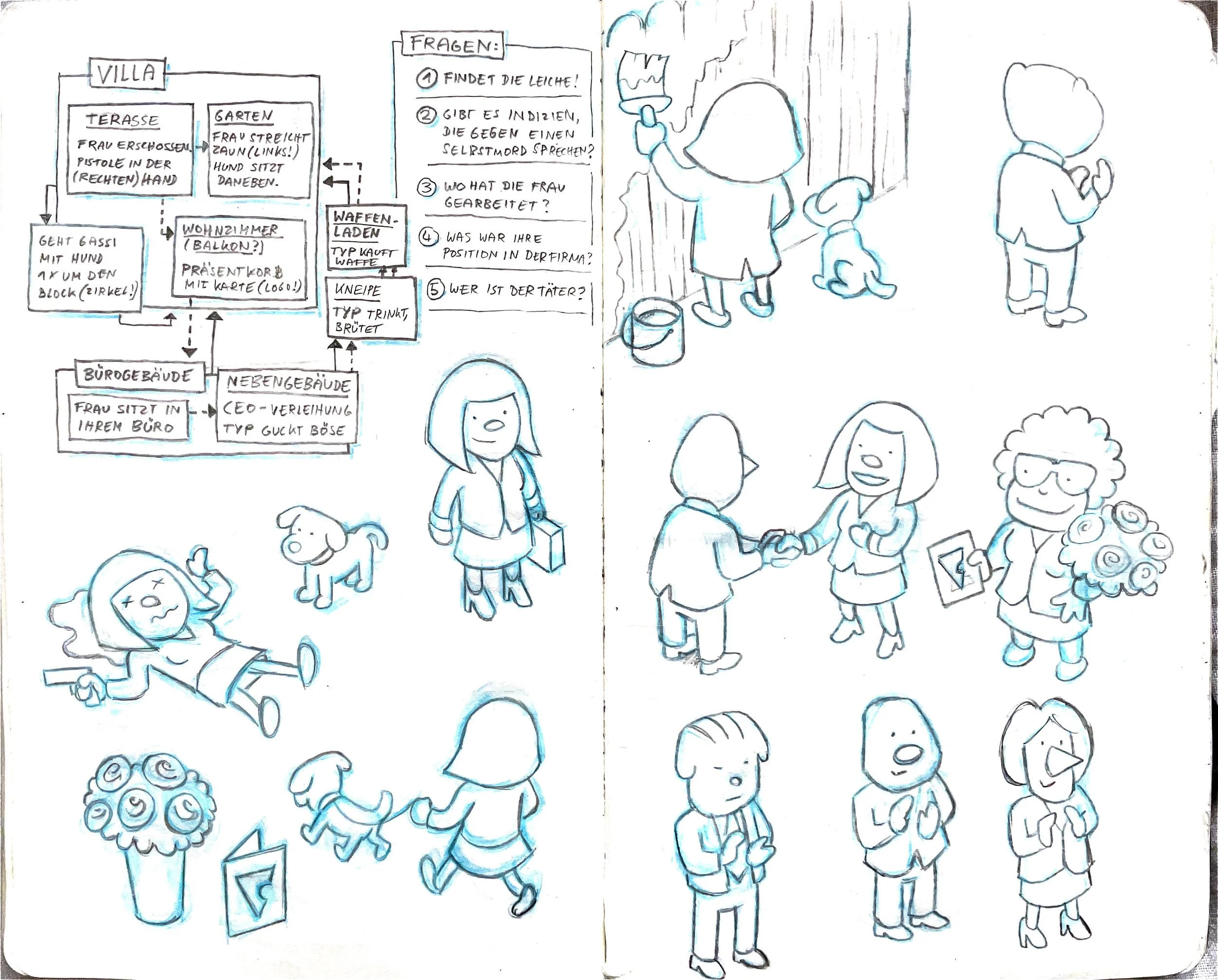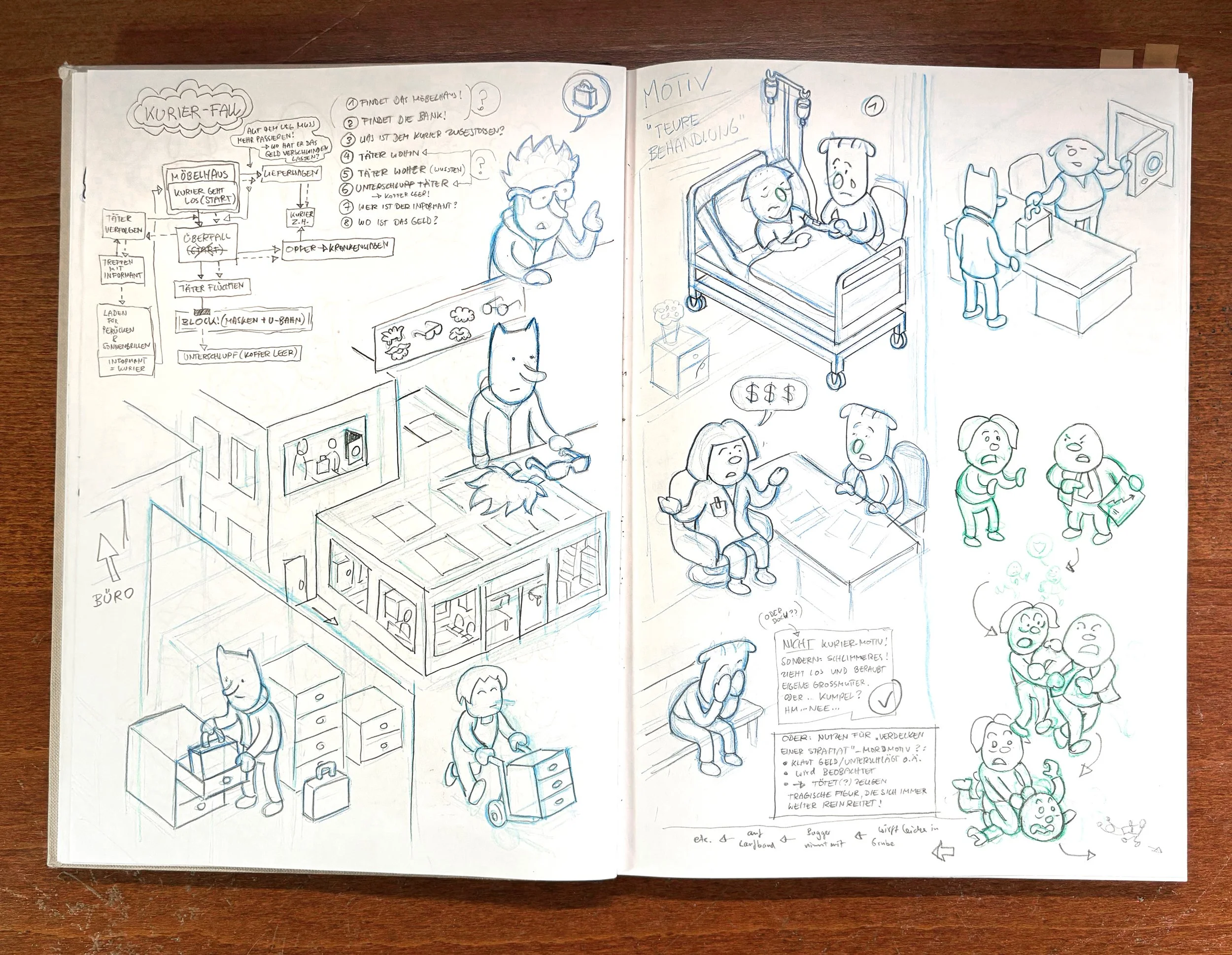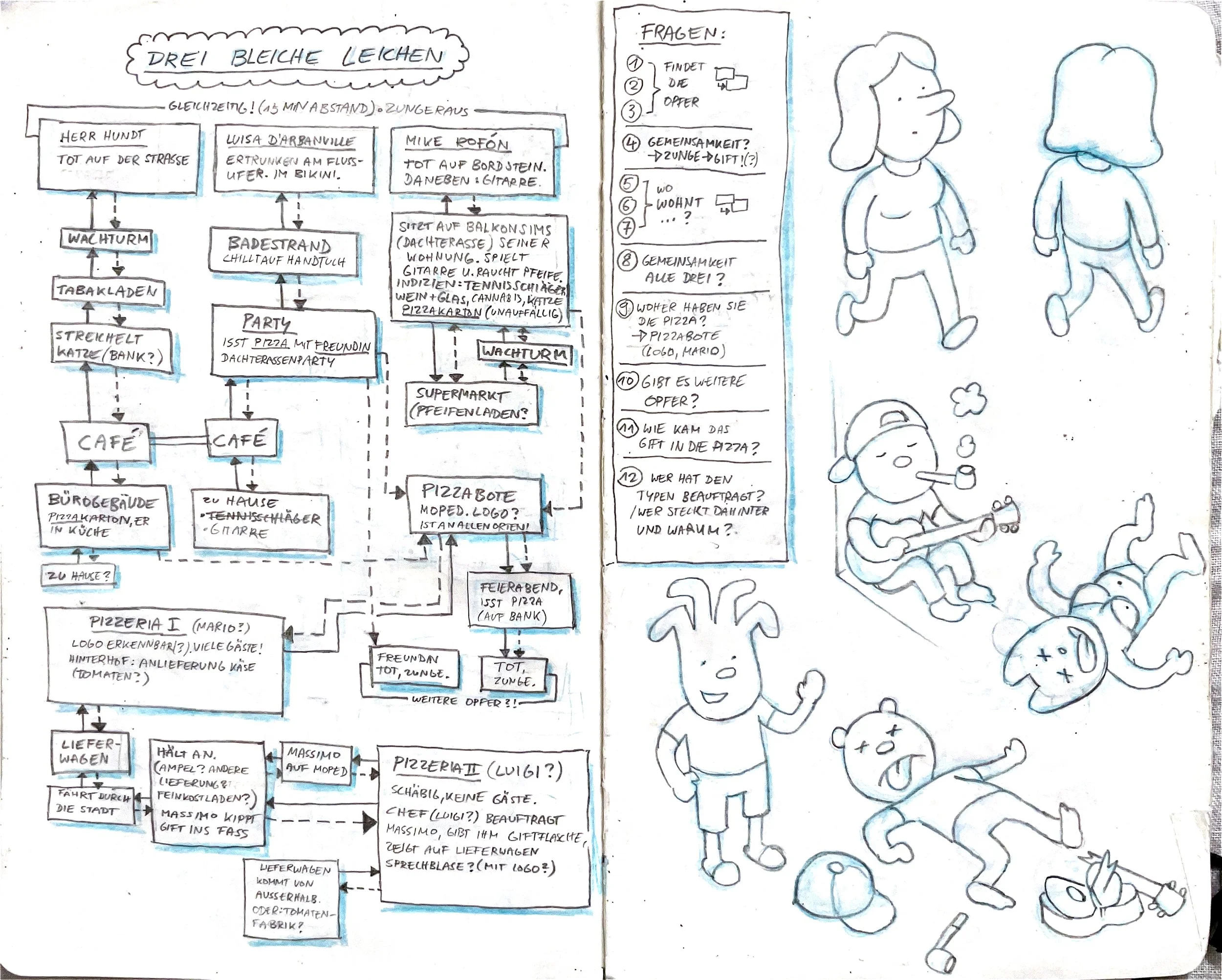 While working on new cases for the second part of MicroMacro Full House, I made elaborate planning sketches in my sketchbook. Nowadays, I rarely do it because I am too lazy, and with experience, I can plan stories with just a few notes. I haven't shown them yet, so this is a nice opportunity. At that time, I was in France at the Atlantic on a camping site, alone for a few days. I wanted to surf, but I was injured or lazy or waiting for better waves, I don't know, and I was sitting in a café all day working on those. It was a pretty nice time.