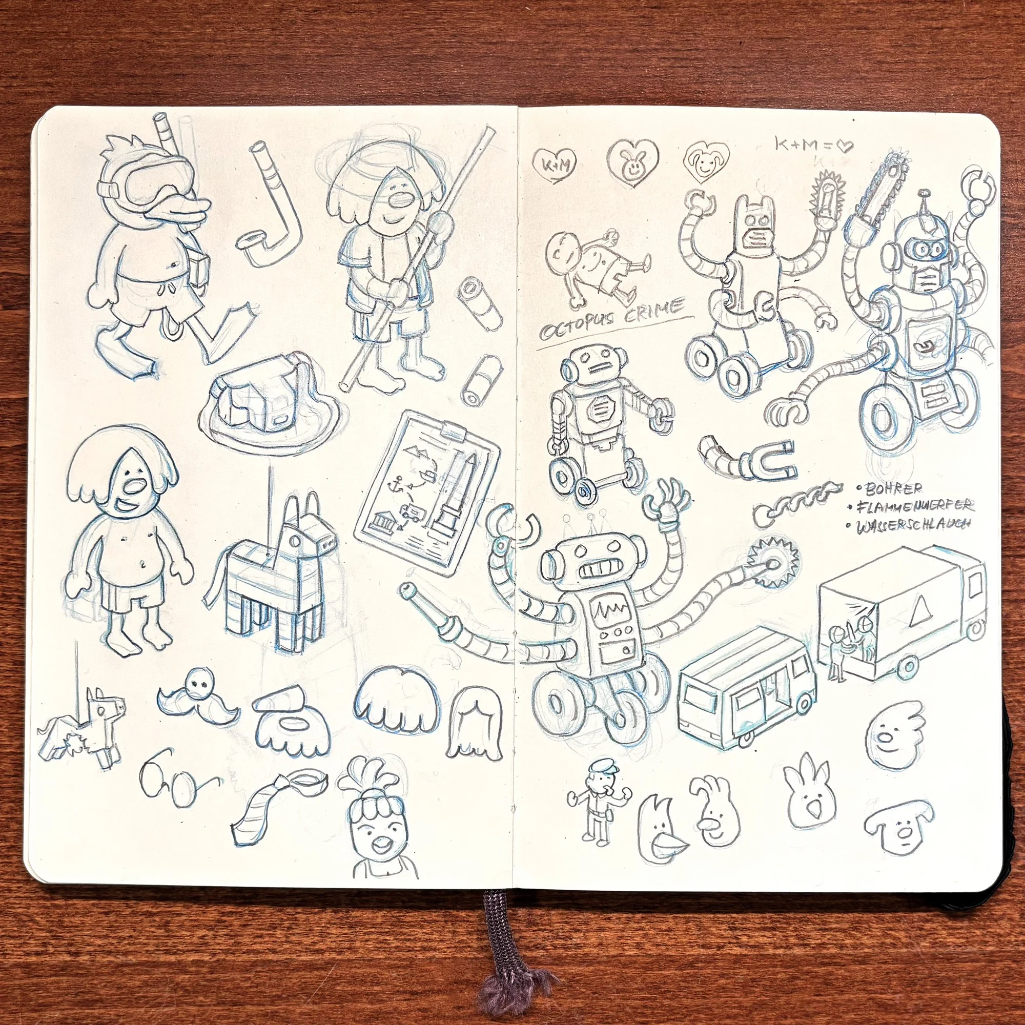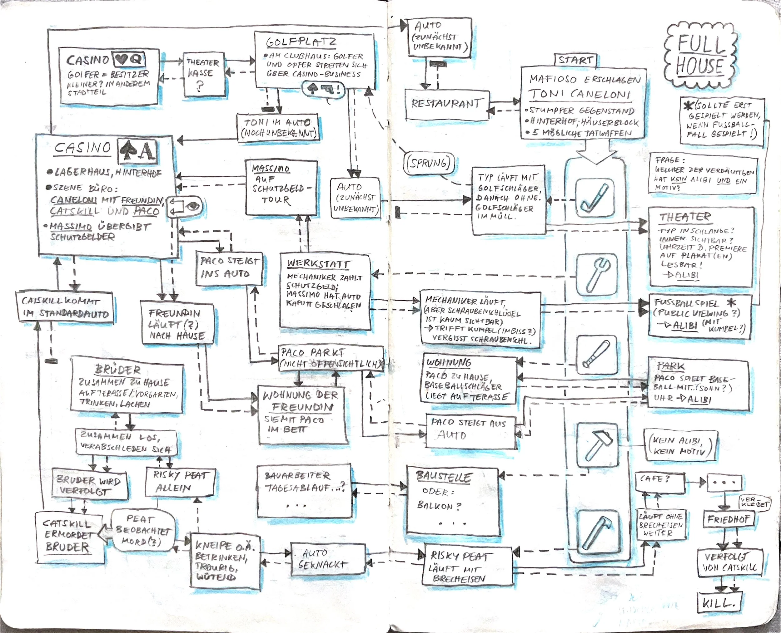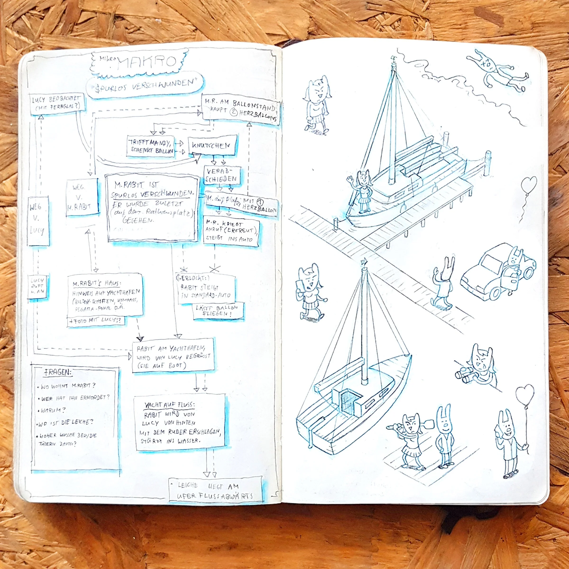 While working on new cases for the second part of MicroMacro Full House, I made elaborate planning sketches in my sketchbook. Nowadays, I rarely do it because I am too lazy, and with experience, I can plan stories with just a few notes. I haven't shown them yet, so this is a nice opportunity. At that time, I was in France at the Atlantic on a camping site, alone for a few days. I wanted to surf, but I was injured or lazy or waiting for better waves, I don't know, and I was sitting in a café all day working on those. It was a pretty nice time.