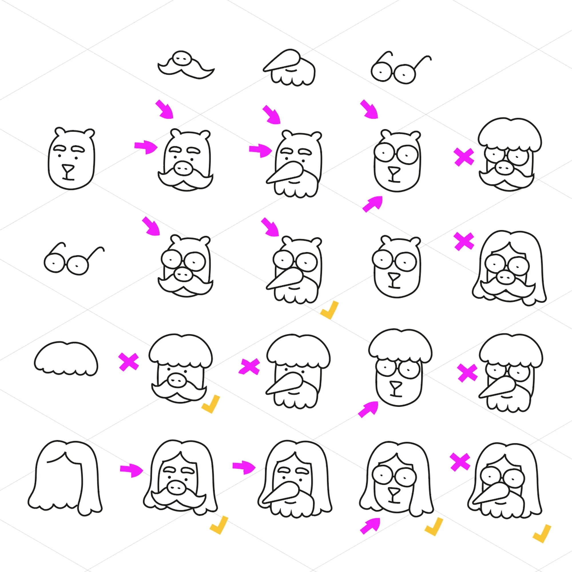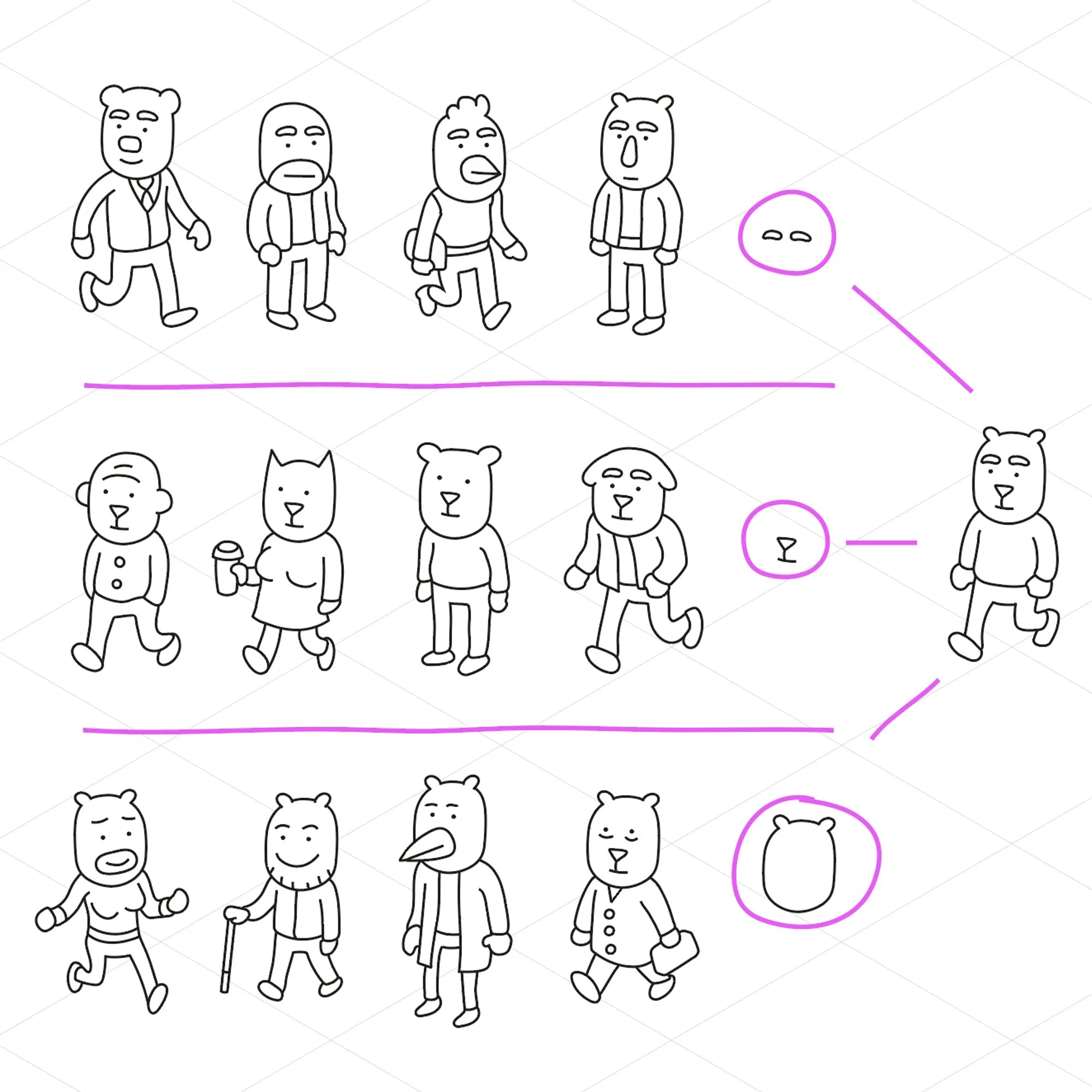 Then there are other, more story-driven cases where the design is largely shaped by the character's role. In Showdown, there is a story about a group of market sellers, and they all have headshapes and names that relate to vegetables, like Tom Ato, Erica Rott, Poe Tato (don’t know how well this works in English; in German, it’s quite funny).